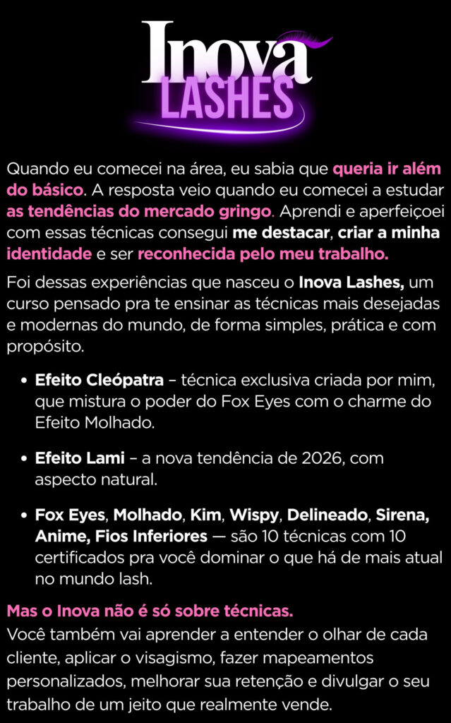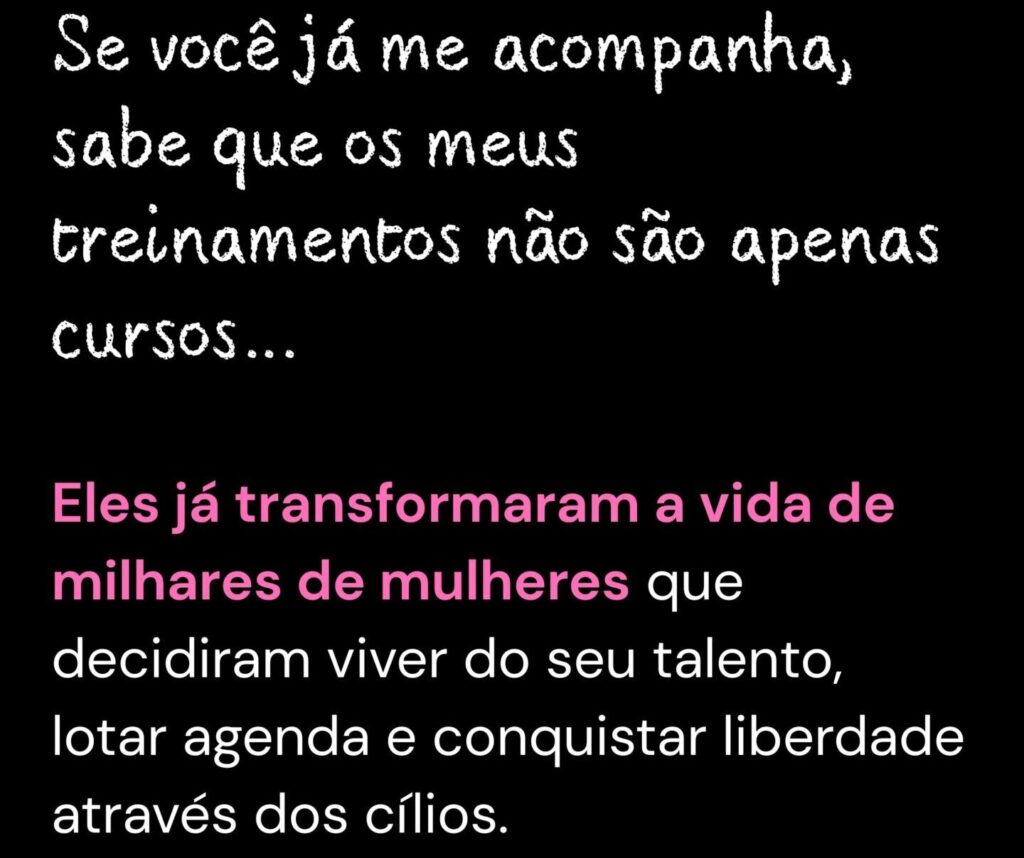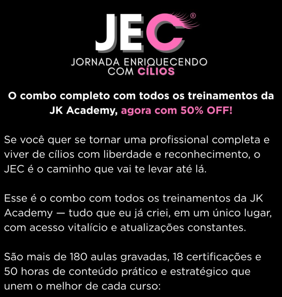 É o momento perfeito pra garantir todos os cursos da JK Academy e ter acesso pra sempre ao maior treinamento da área lash do Brasil.